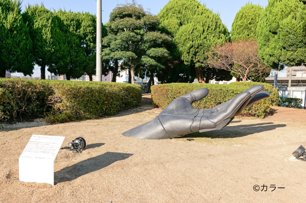 初号機の手をイメージした彫刻は全長約3.62m、重さ約9tと迫力満点!記念撮影をする人も多く、その人気ぶりがうかがえます。第3弾の「ロンギヌスの槍」の鋳造も手掛けた地元企業・株式会社宇部スチールによって制作されています。