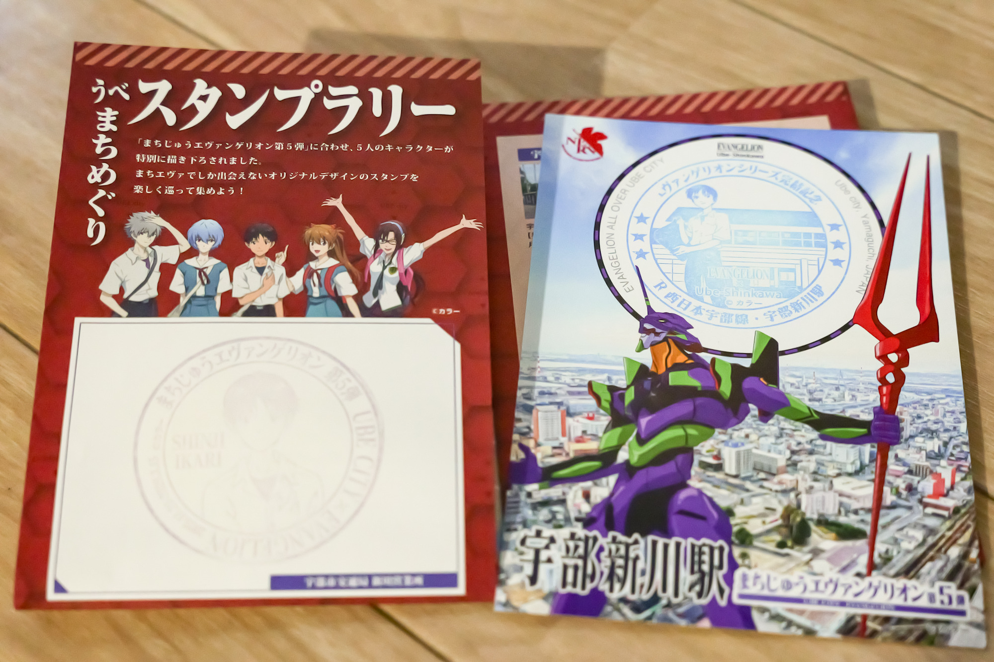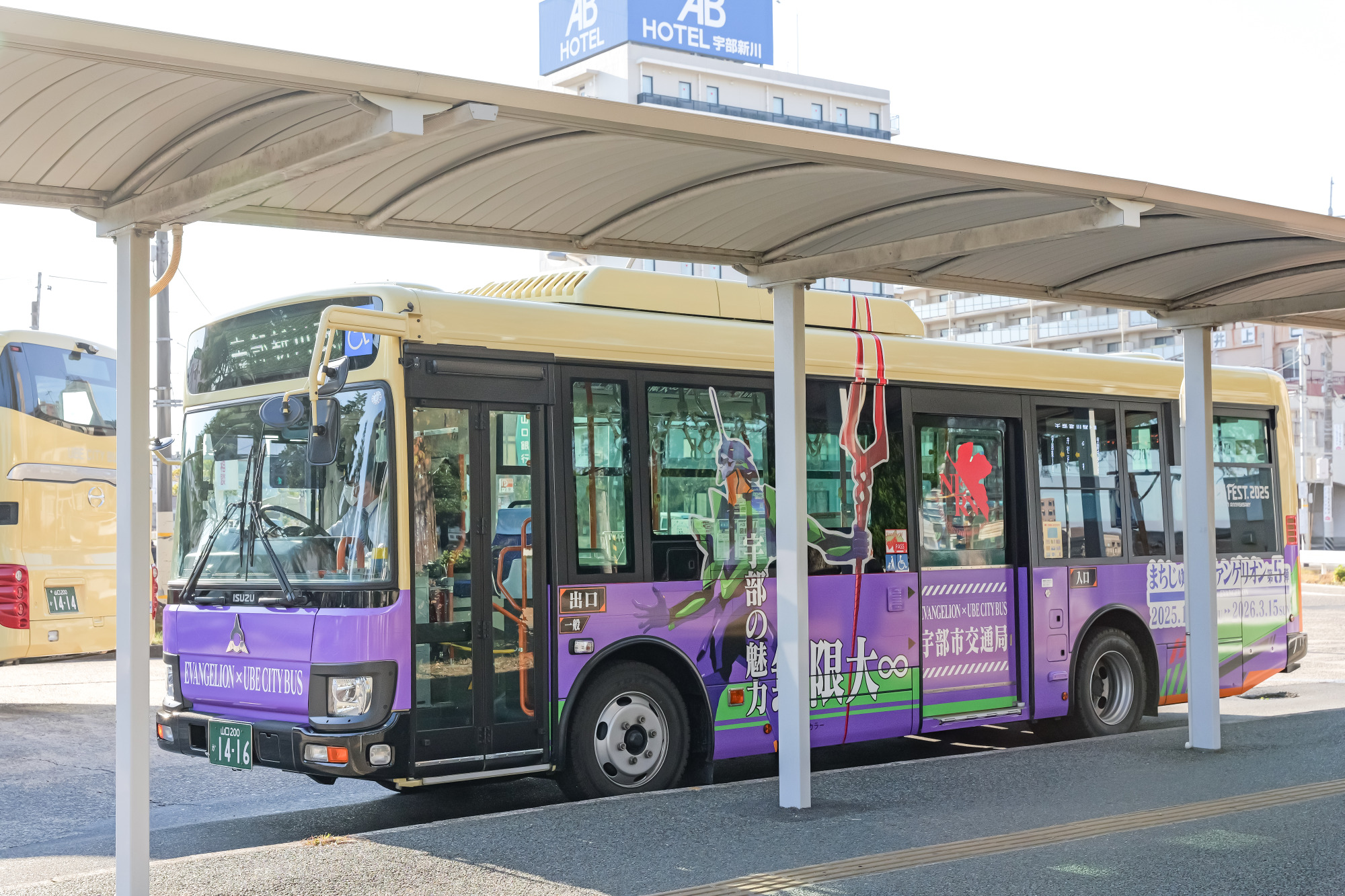 さらに、運が良ければ出会えるラッピングバスにも駅で遭遇!まちじゅうエヴァンゲリオン第5弾の期間中、宇部市内やその近隣の市を巡っています。WEBサイトに運行表が掲載されているので、出会いたい人はこちらをチェックするのもおすすめです。