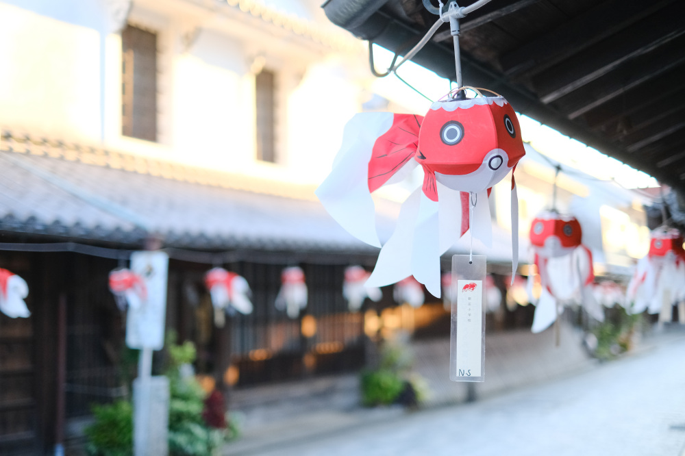 白壁の町並みを歩けば、足元にも軒先にも、あちこちに“金魚”の姿が。季節や時間帯でデザインやライトアップが変わるので、思わず写真を撮りたくなるかわいさです。