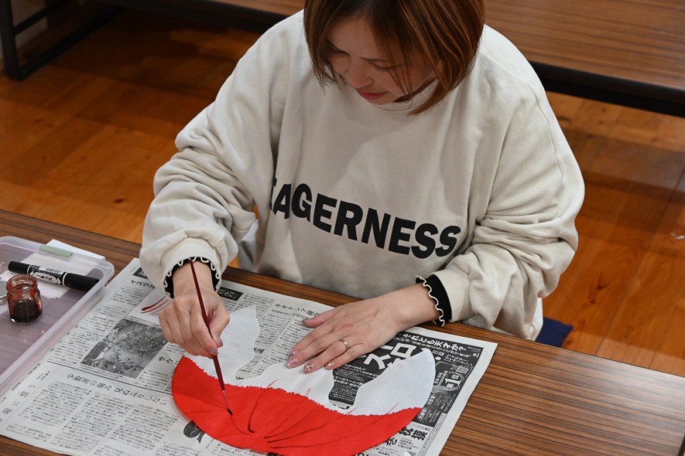 体験では、目や胴体への柄入れ、ヒレや尾の貼り付けをします。レクチャーを受けながら練習用の用紙に染料の量や筆の動かし方を覚えていきます。