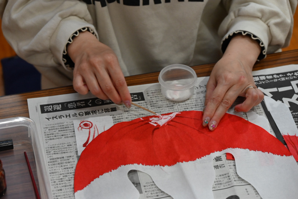 用意された目を貼り付けます。目の位置によって顔の印象が変わるので、慎重に……。目の周りを染料で囲ってお顔は完成!丸く囲む以外に、まつげを描いてかわいく仕上げる人も多いそうです。個性豊かな表情が作れるのは、体験ならではの魅力ですよね。