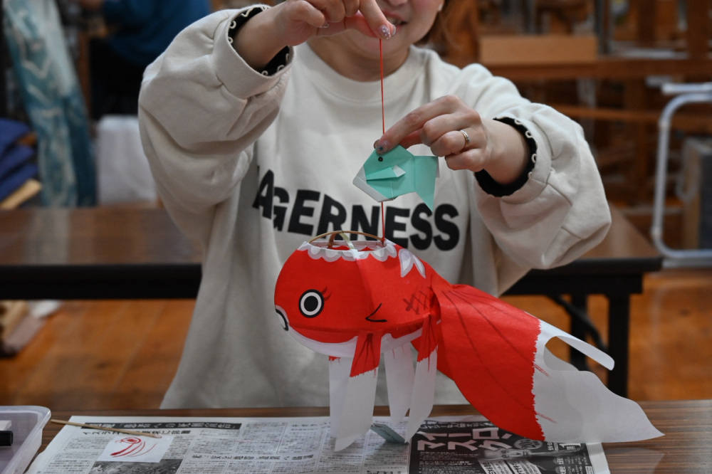 金魚ちょうちんの完成!金魚の折り紙をいただいたので、紐に通して親子金魚にもできます。