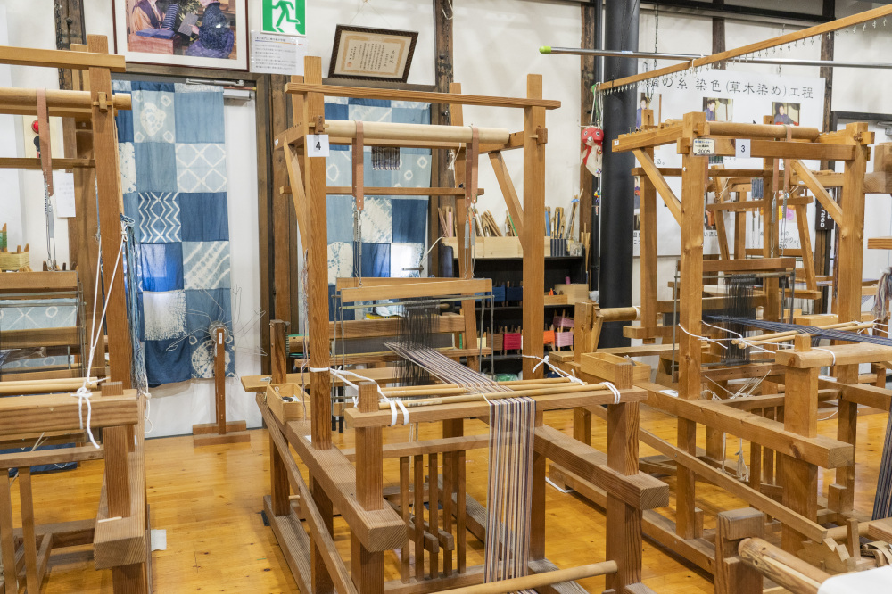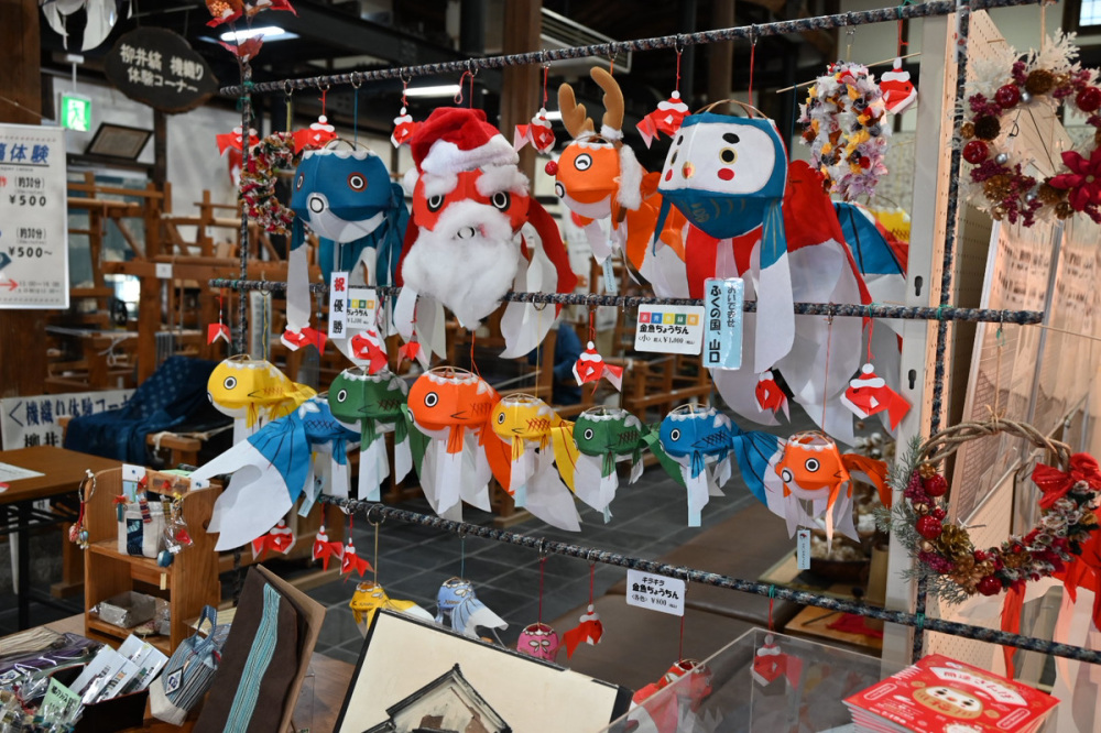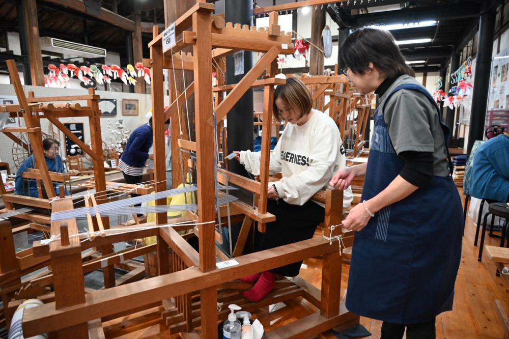 金魚ちょうちんの製作体験ができるのが、白壁の町並みにある「やない西蔵」。実はここでは、柳井の伝統織物「柳井縞」の体験もできるんです。