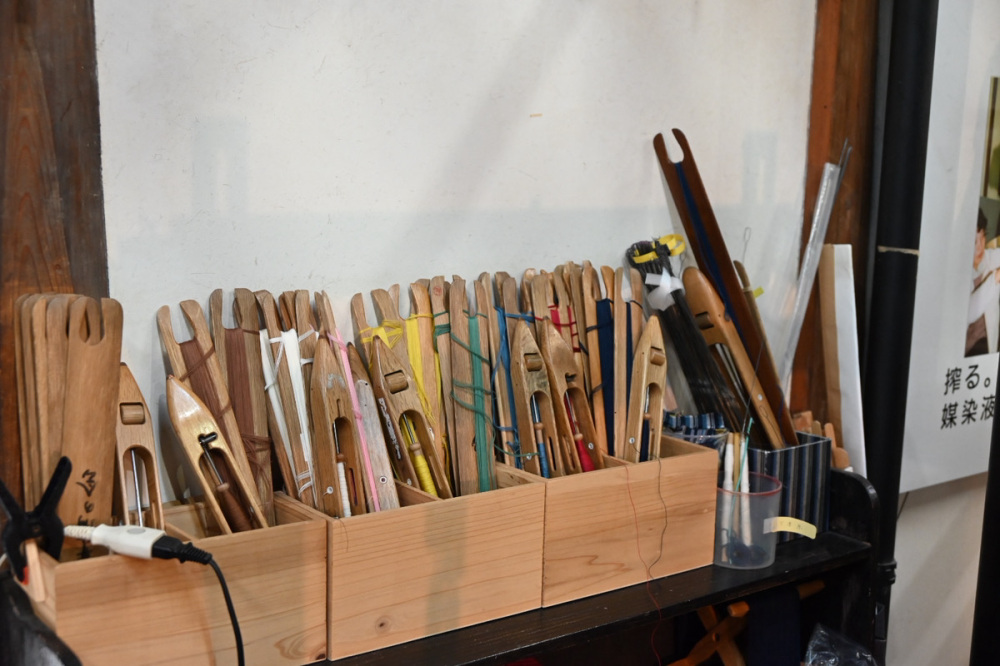 6台ある織機にはそれぞれ違う色の縦糸がセットされているので気に入った色の台を選びます。
