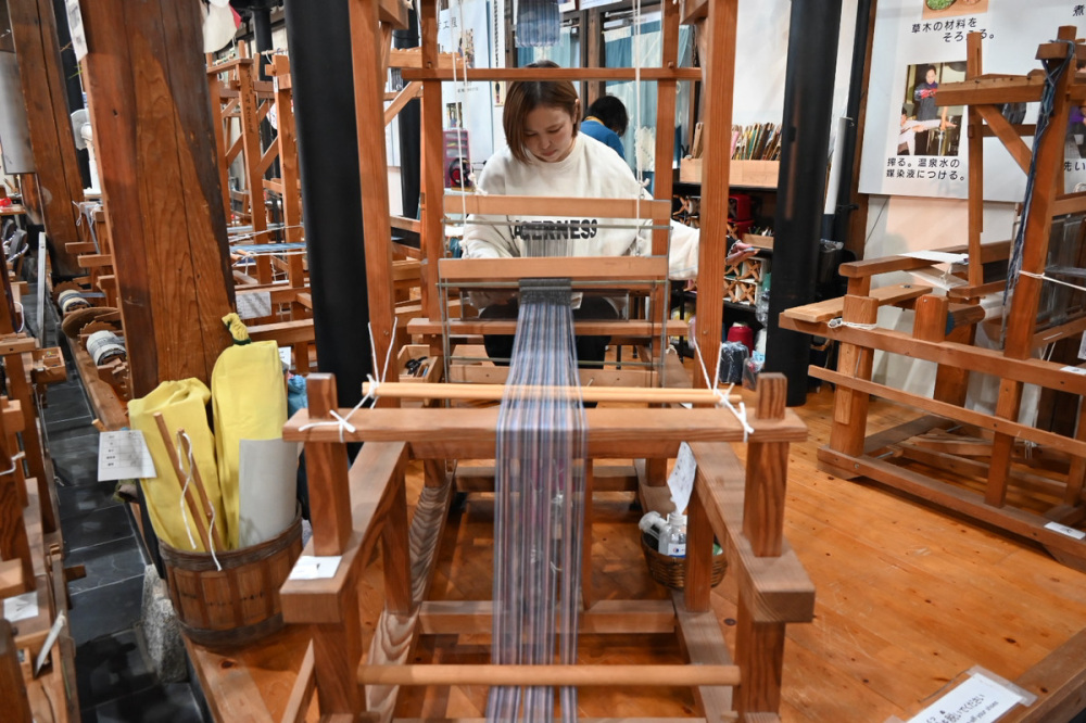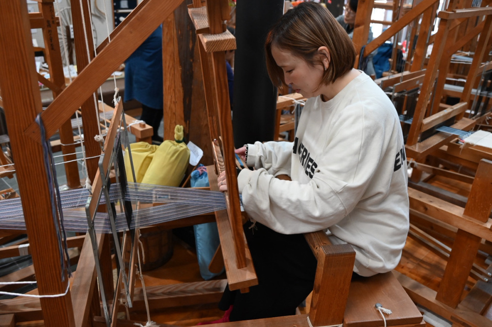 手と足の両方を使って織っていきます。座面に腰をかけ、横糸を右に左に渡しながら黙々と織っていきます。足が届くようであれば子どもでも体験できるとのこと。