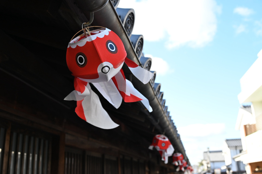 山口県柳井市の白壁の町並みは、江戸時代の商家が続く約200mの石畳が残る歴史地区。甘露醤油や柳井木綿の交易で栄えた商人の町で、その文化から「金魚ちょうちん」「柳井縞」といった柳井らしい特産品が生まれました。町を歩けば、軒先や足元に赤い金魚ちょうちんがゆらゆら。白壁の風景に映えるかわいらしい姿が、柳井らしさを感じさせてくれます。