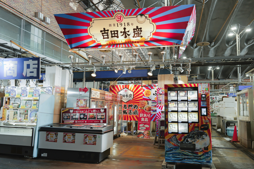 創業100年超のふぐ仲卸企業・吉田水産による「冷凍ふぐ自動販売機」では、冷凍でふぐの商品を購入でき、遠方へ宅配で送る人もいるのだそう。
