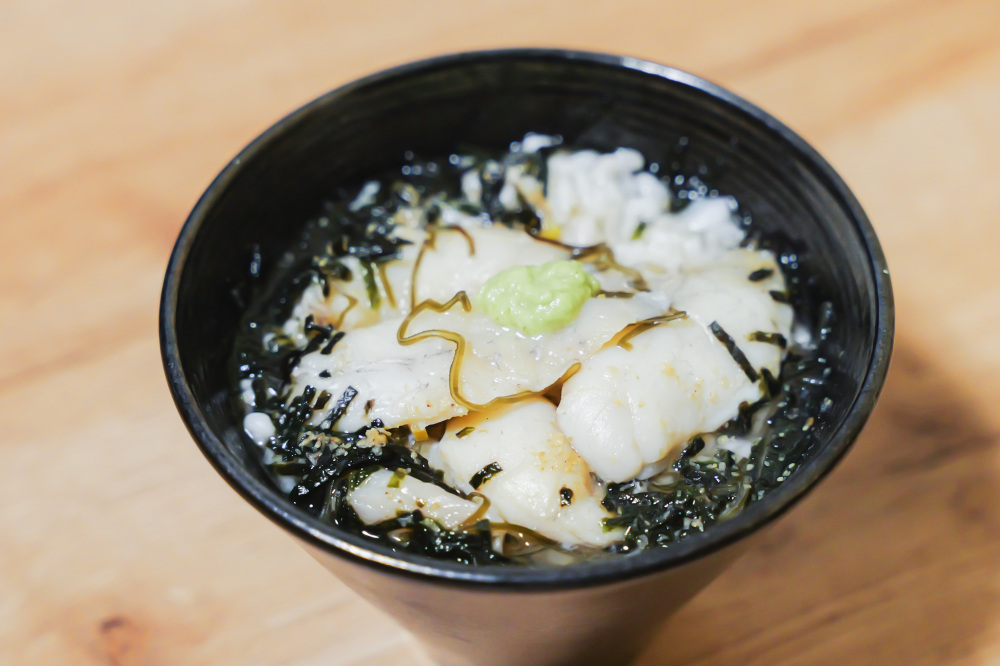 今回オーダーしたのは、ふぐの白子を使った「白子焼き」!貴重な天然ふぐの白子を使った数量限定メニューながら、6個で980円というコスパの良さに驚きます。