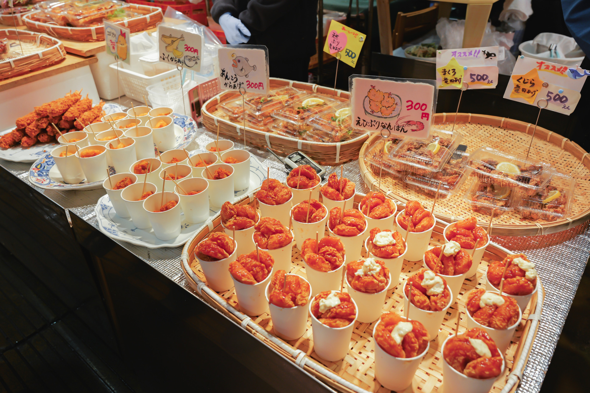 「ふくからあげ」(300円)と「ふく汁」(400円)は、それぞれワンコイン以下のふぐメニュー。“これは絶対食べりっちゃ”とポップに書かれたふく汁には、大きなふぐの身が。ひと口で心が和む、やさしい味わいが広がります。