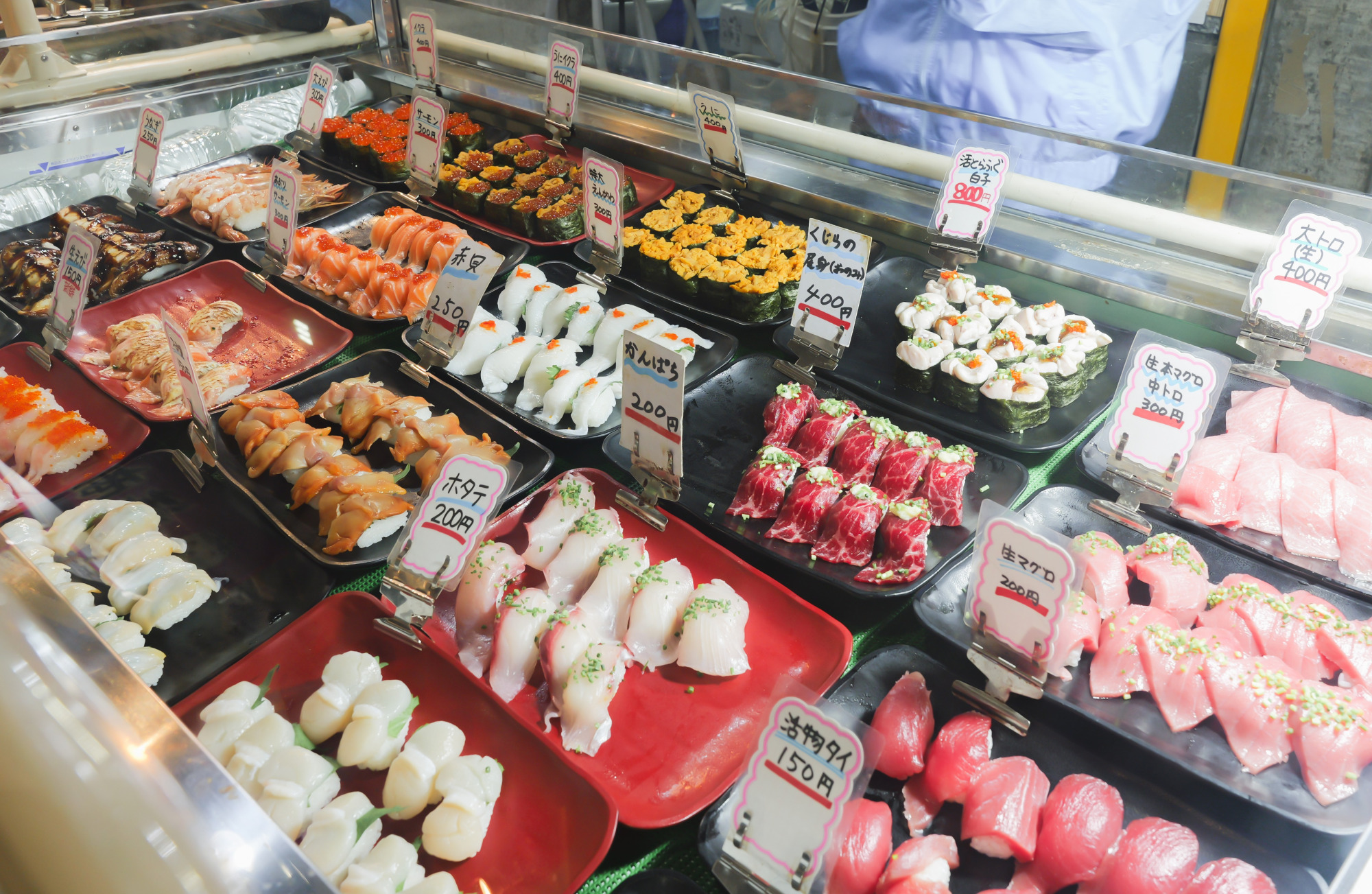 馬関街の日の店頭には、いろいろな種類のお寿司がずらり!シャリを覆うように大きなネタがのったお寿司は、見るだけで心が躍ります……。