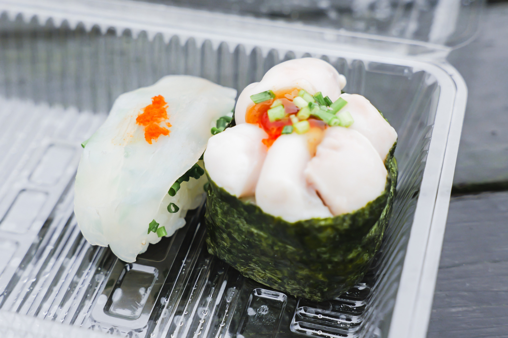 「活とらふぐ白子」(800円)と「活物ふく」(200円)は、どちらも新鮮なふぐを贅沢に使ったお寿司。海苔からあふれそうなほど白子がのった軍艦は、つややかな白子が口の中ですっと溶けて、広がるクリーミーな風味がたまりません。
