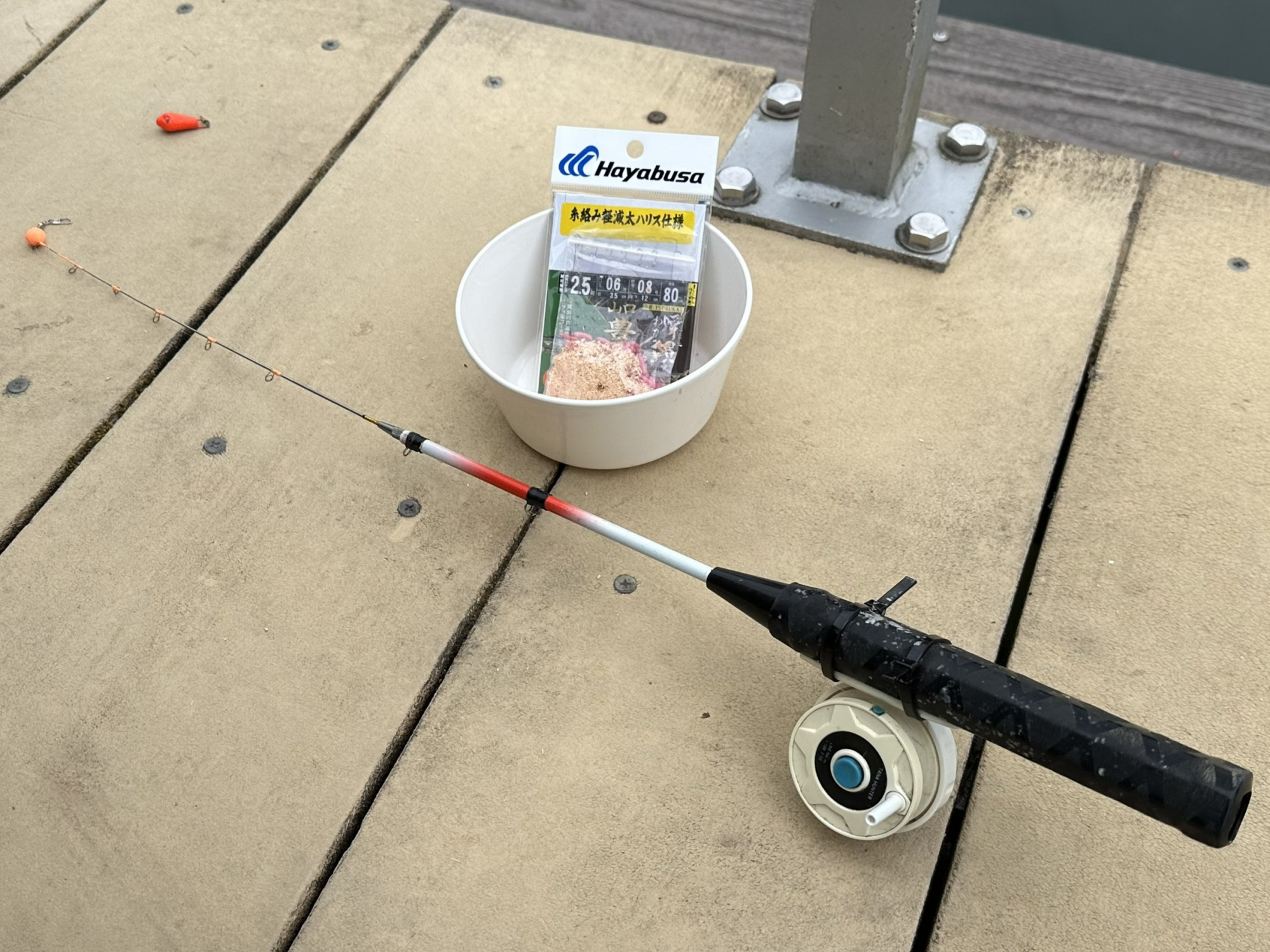 桟橋に下りて場所を決め、管理棟でレンタルした持ちやすい小さなサイズの釣り竿に仕掛けとおもりを付けます。