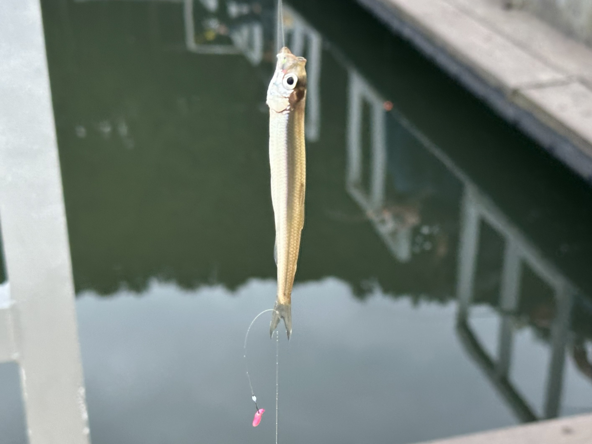 そんな息子の様子を横目に、私の竿にはなかなかあたりが来ず、餌を変えようかなと仕掛けを巻き上げてみるとまさかのワカサギが釣れていてびっくり