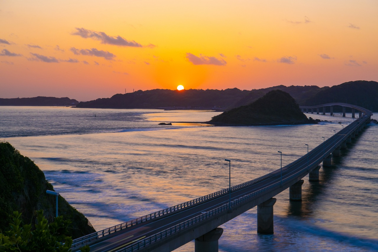 橋の長さも無料で渡れる一般道としては日本屈指の長さです。(1,780m)青く美しい海を眺め、海風を感じながらサイクリングや散歩を楽しむのもおすすめです。特に夏の晴れた日は海の青と道路の白、島の緑のコントラストが美しく、まさに絶好のフォトスポットです。