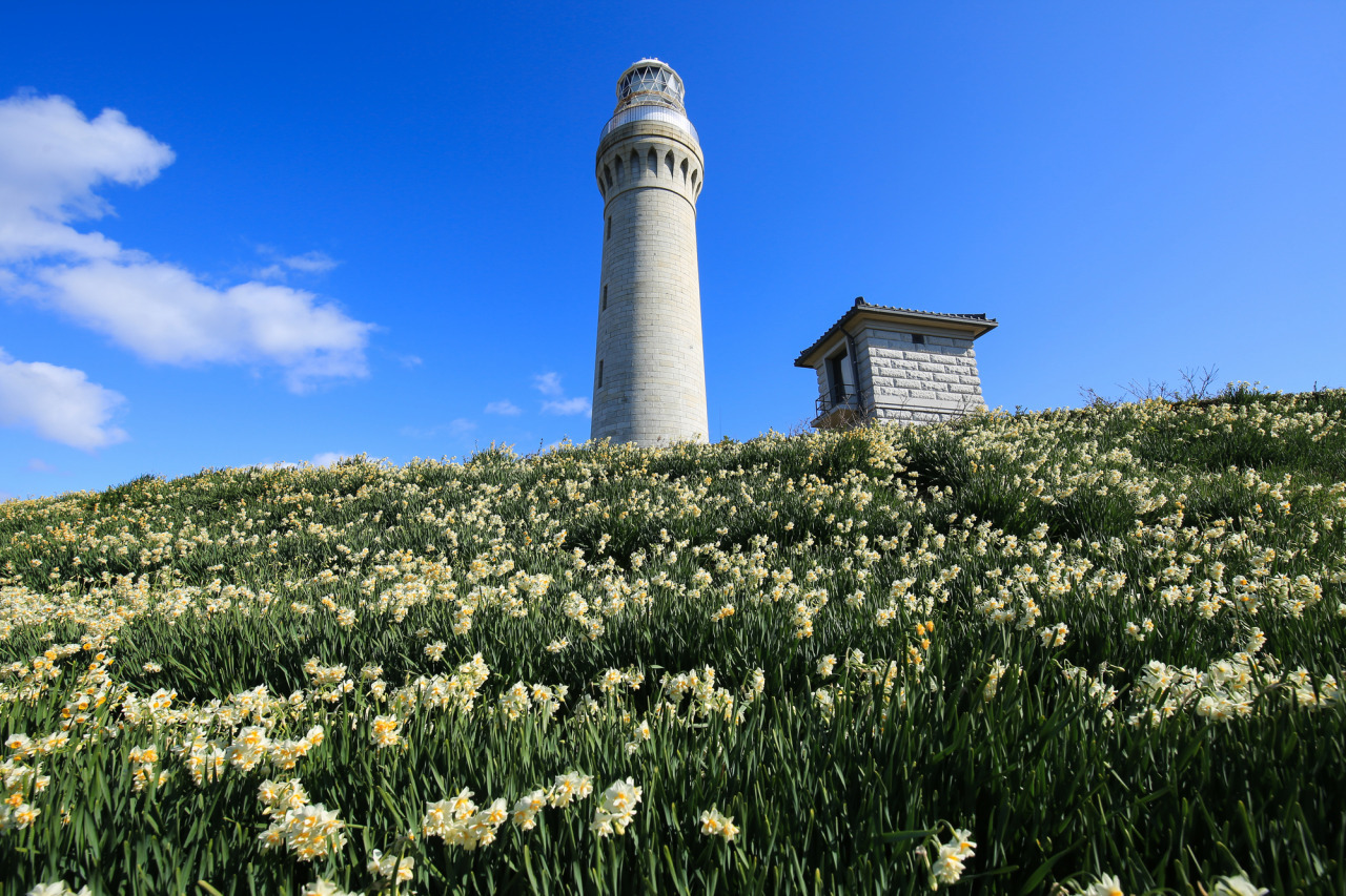 1月下旬から2月中旬にかけては、あたり一面スイセンが咲き乱れ、灯台と調和した美しい景色を見ることができます。