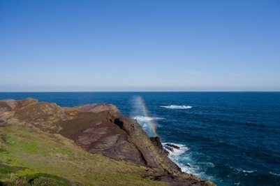 打ち寄せる波が、絶壁下海面近くのわずか縦1m、幅20cmの穴に突入し、奥の空洞に圧縮された空気が海水を激しく外に出そうとして、上方に海水を噴出させます。