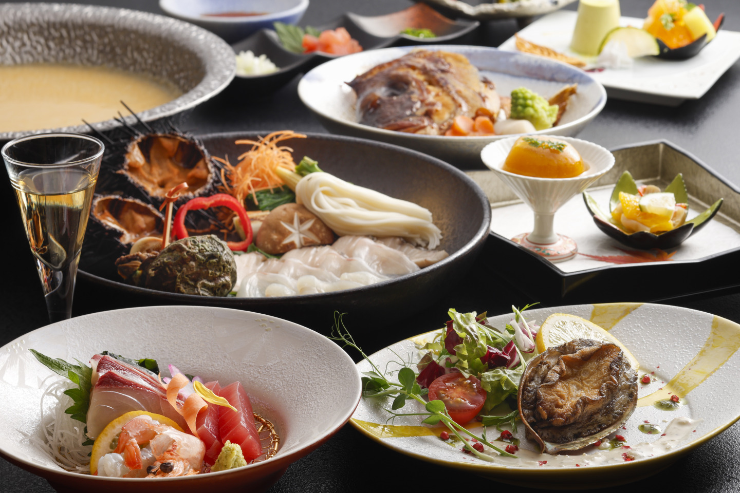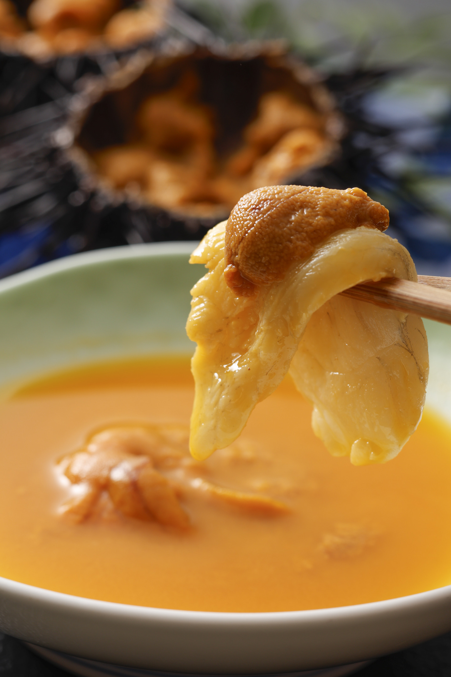 「長州海鮮うにしゃぶ」は、ウニスープで山口県の海鮮をしゃぶしゃぶする贅沢な一品。ウニを惜しげもなく使った濃厚なスープに、山口県の海の幸や野菜をサッとくぐらせて食べます。具材にも長門市のブランドウニ「長州の磯守(いそもり)」または天然ウニがついていて、まさにウニ尽くし。スープのベースとなる出汁やつけダレ、具材はお宿によって様々。 それぞれの宿が趣向を凝らした逸品をお宿で贅沢に楽しめます。