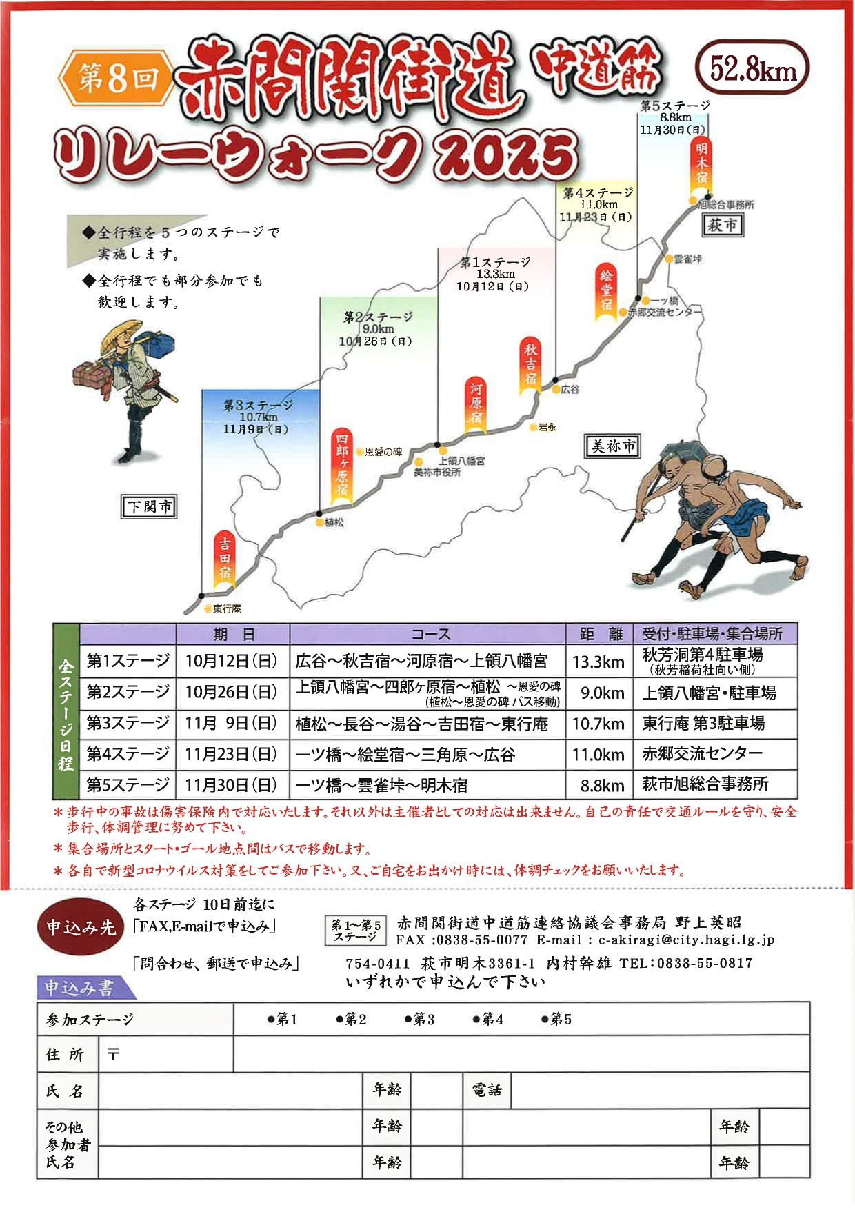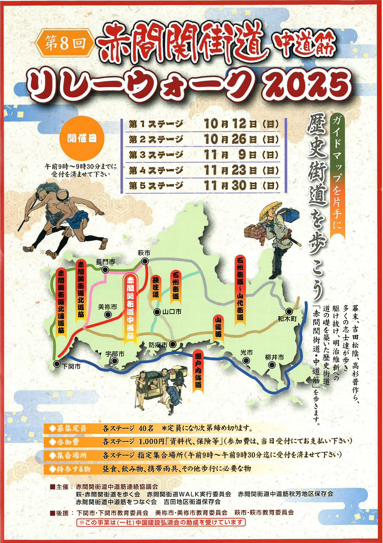 幕末、吉田松陰、高杉晋作ら、多くの志士達が歩き、駆け抜け、明治維新への道の礎を築いた歴史街道「赤間関街道・中道筋」の下関市吉田から萩市明木までの全行程52.8㎞を5つのステージに分けて歩きます。