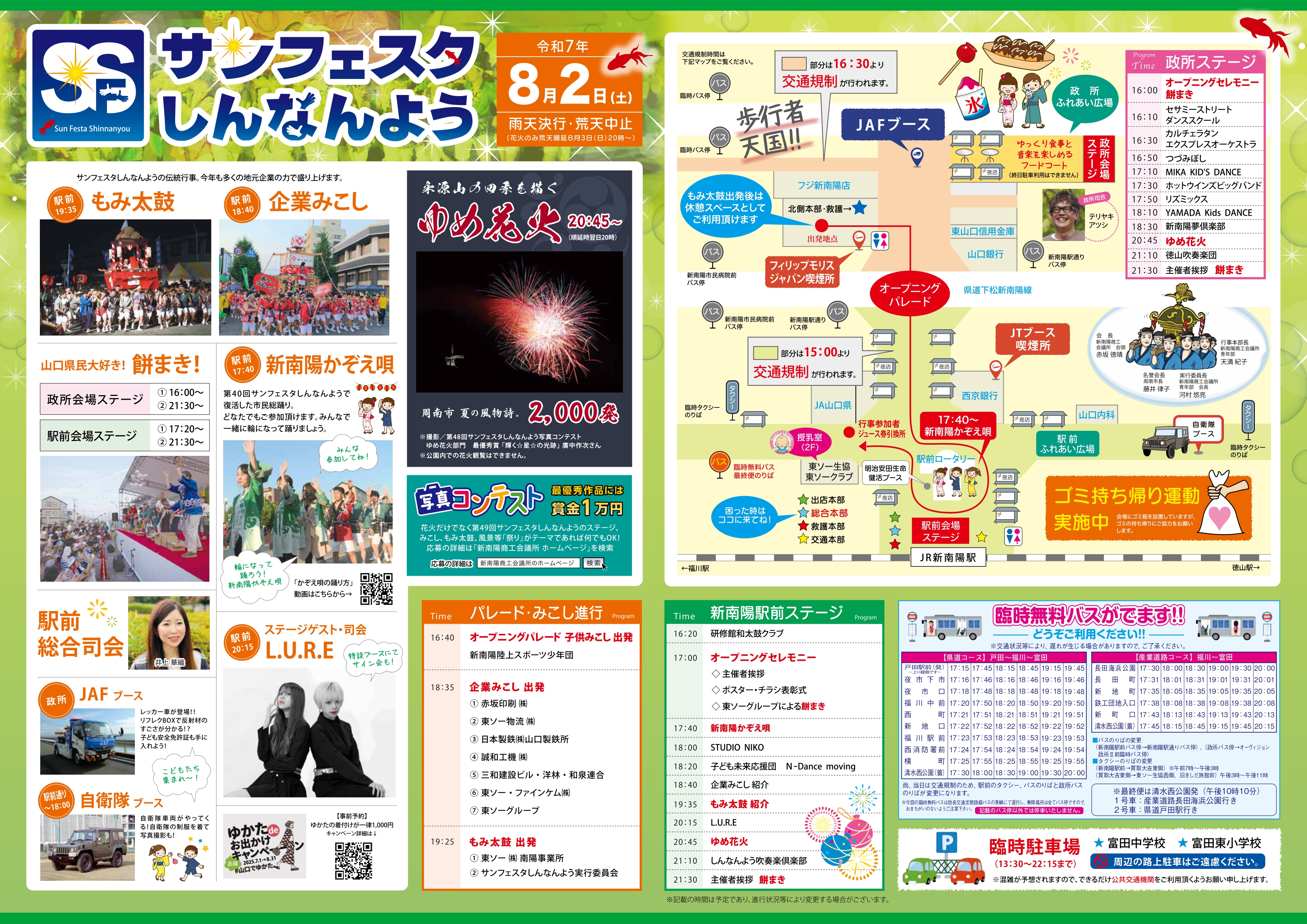 - 15:30~22:00(ゆめ花火は20:45~)※雨天決行、荒天中止(花火は8/2(日)に順延)