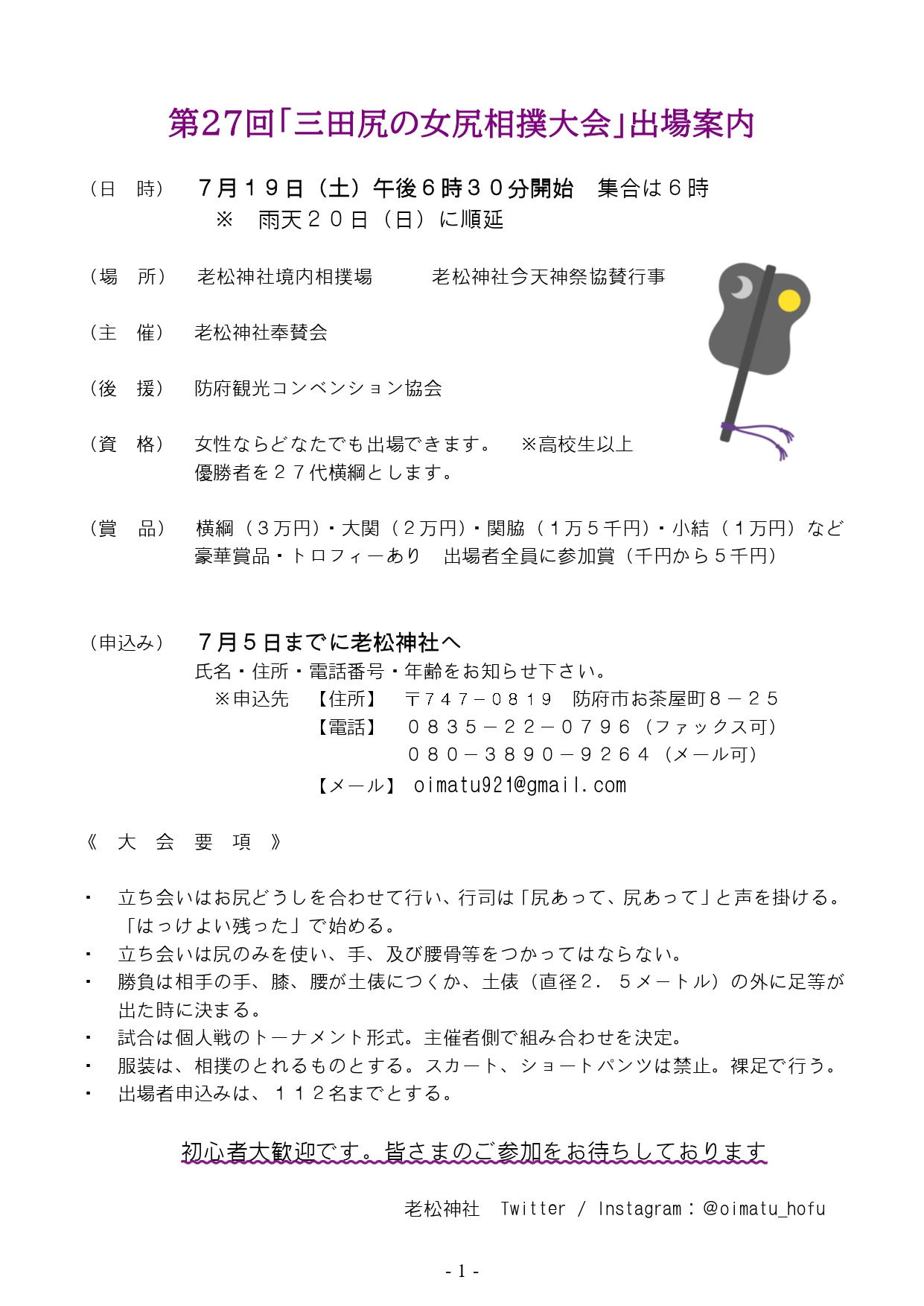 三田尻の「尻」にちなんで、平成8年に始まった女性だけの尻相撲大会。「尻押しだし」「尻すかし」など決まり手もユニークなもので、年々参加者も増え、会場も熱気と笑いに包まれます。