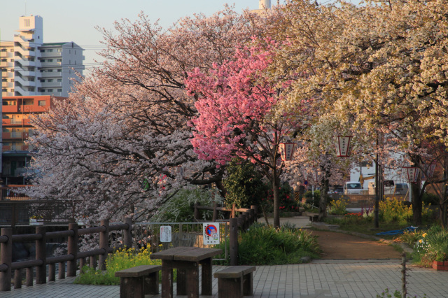 周南市の中心部を流れる東川沿いの東川緑地公園は、市内有数の桜の名所として知られ、約100本のソメイヨシノが、3月下旬から4月上旬に見頃をむかえます。