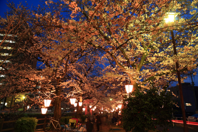夕方になるとぼんぼりに明かりが灯り、昼間とは違う雰囲気の桜並木をを楽しむことができます。