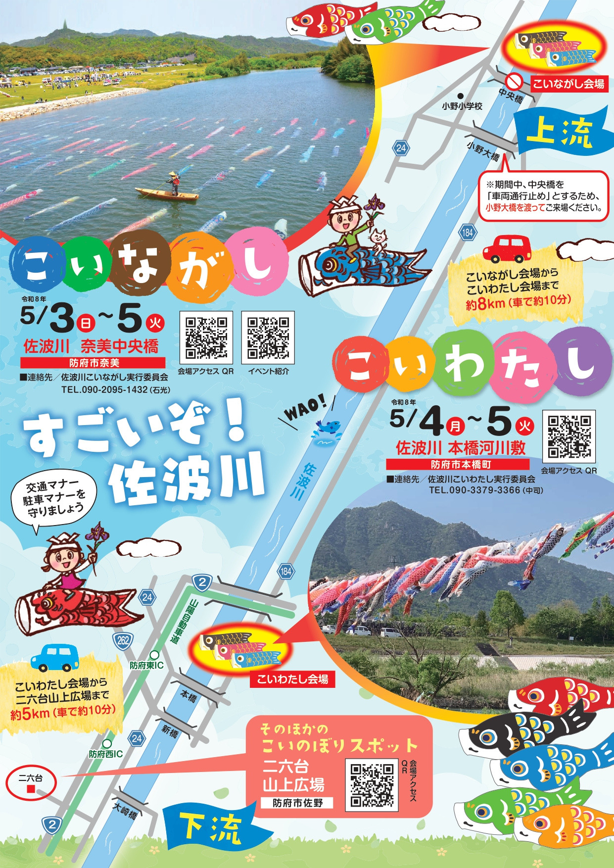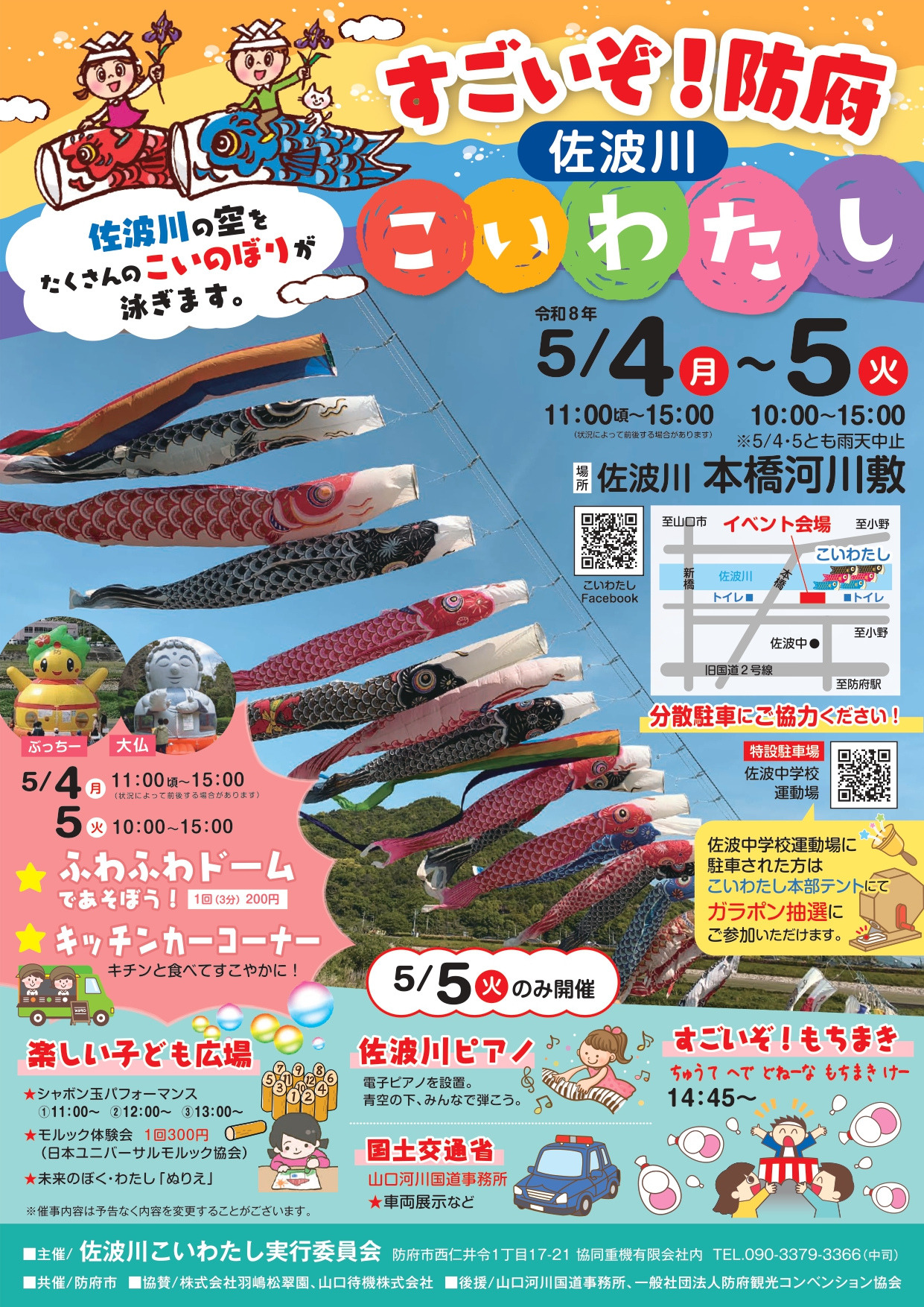 山口県下有数の河川「佐波川」の下流域に架かる本橋付近で、約100匹の鯉のぼりが防府の空をゆうゆうと舞います。