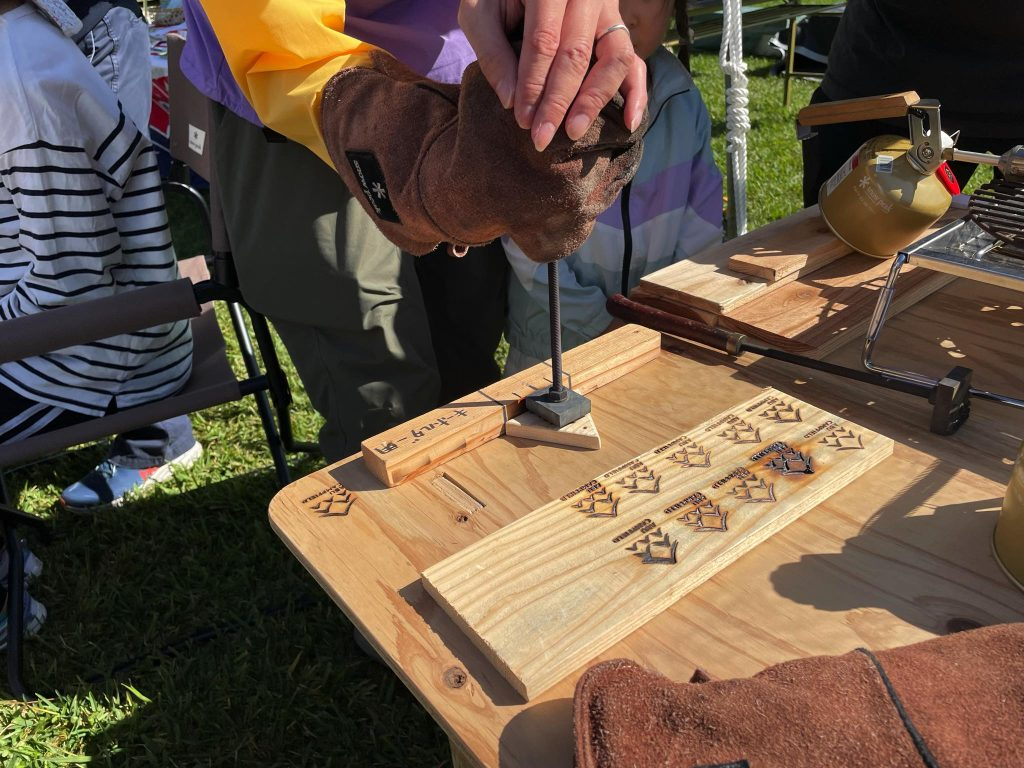 杉板から形成したものを磨き上げ、焼印をしてキーホルダーを作ります。