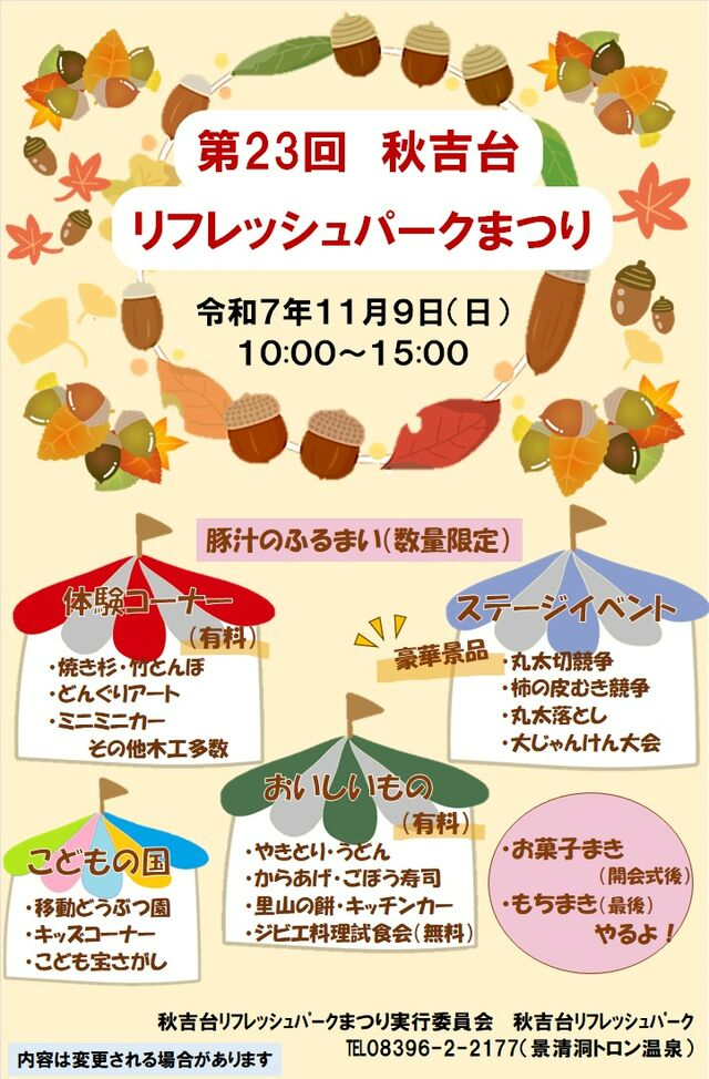 | 11/9(日) 第23回秋吉台リフレッシュパークまつり | ステージイベントや体験メニューの詳細は決まり次第こちらでお知らせいたします |