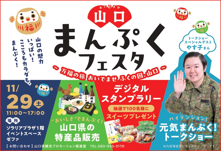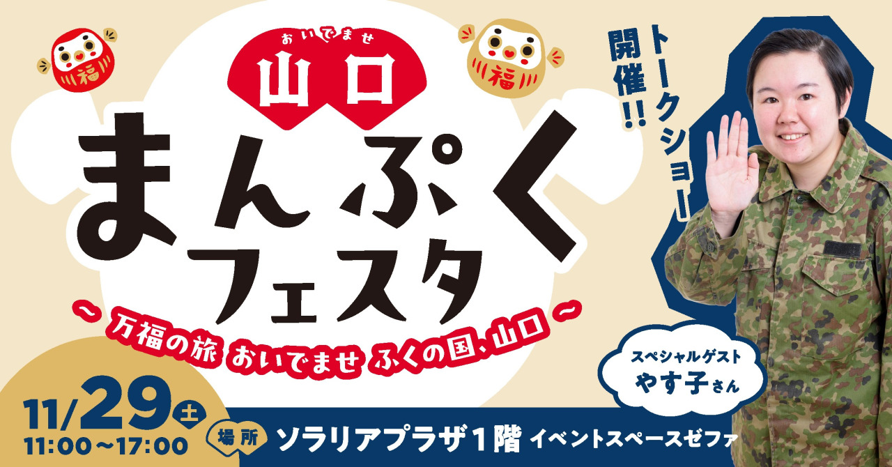 福岡市天神の商業施設「ソラリアプラザ」1階イベントスペース ゼファにて、「山口まんぷくフェスタ」を開催します。山口デスティネーションキャンペーン(DC)プレキャンペーンのイベントとして山口県の観光PR展示や県内の特産品・地酒販売などを予定しています。山口県内の各市町から、とっておきのグルメや特産品が大集合!当日は山口県宇部市出身のお笑い芸人「やす子さん」(山口ふるさと大使)によるスペシャルトークショーも開催予定!