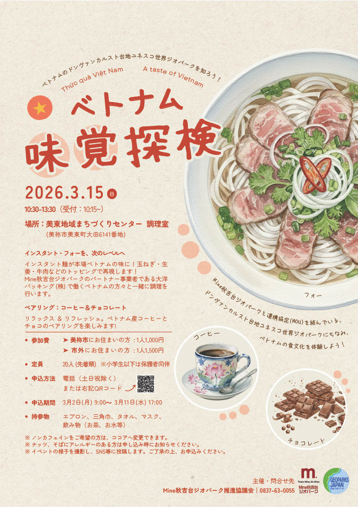 Mine秋吉台ジオパークと連携協定(MOU)を結んでいる、ドンヴァンカルスト台地ユネスコ世界ジオパークにちなみ、ベトナムの食文化を体験しよう!