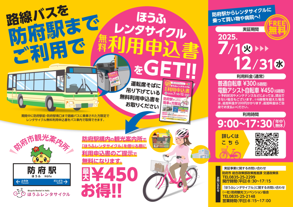 防府市路線バス利用でレンタサイクルが無料になります‼
