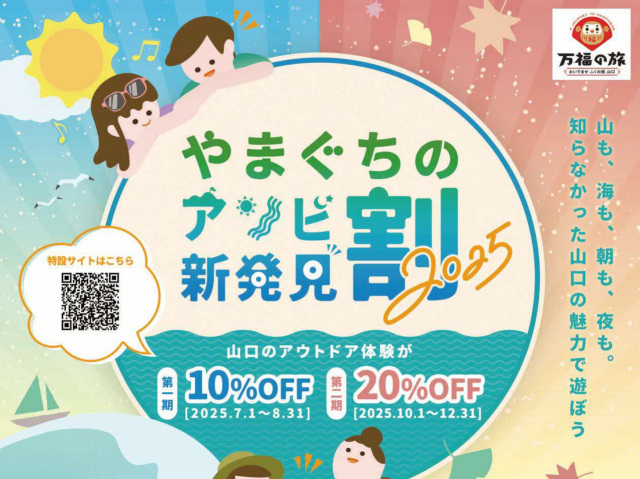 オンライン予約サイト「アソビュー!」の特設サイトにて、アウトドアアクティビティなど、キャンペーンの対象となるコンテンツの予約・購入時に使用可能な割引クーポンが発行されます。キャンペーンは二期あり、割引率は第一期が10%、第二期が山口プレデスティネーションキャンペーン期間につき20%割引です