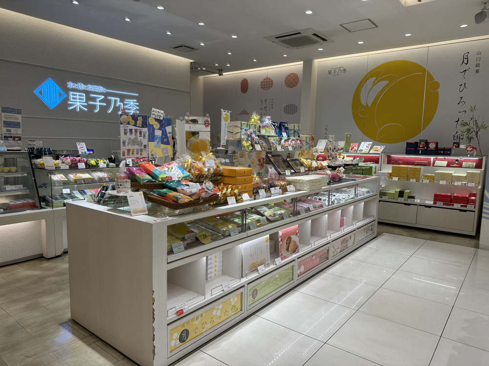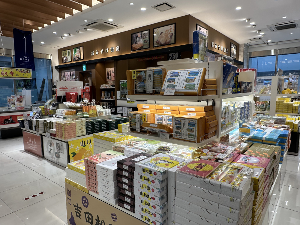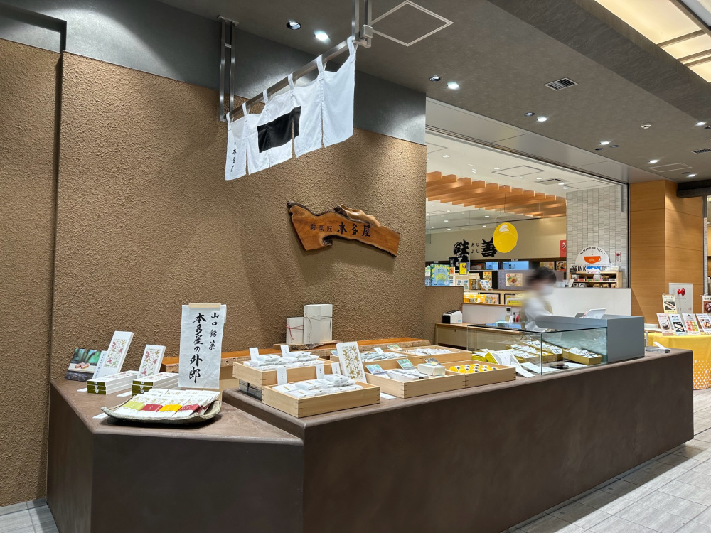 新幹線口・中央入口の正面エスカレーターで2階へ上がって左手にある「山口銘品館」は、山口県を代表する10店舗ほどのお土産店が軒を連ねるエリアです!広々とした明るい店内には、山口銘菓「月でひろった卵」やういろう、かまぼこをはじめとする練り物など、人気商品がたくさん集まっています。上質な手土産からばらまき用のお手頃なお土産まで、多彩な品揃えが魅力です。