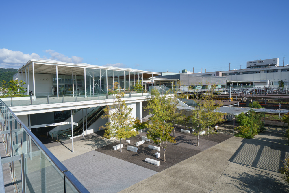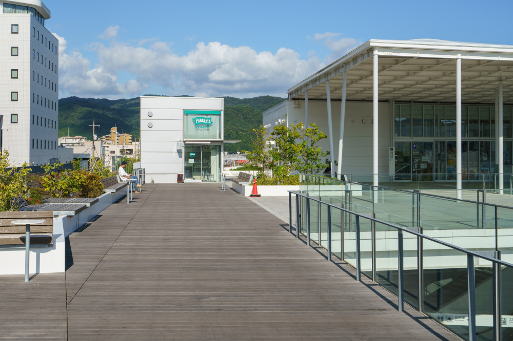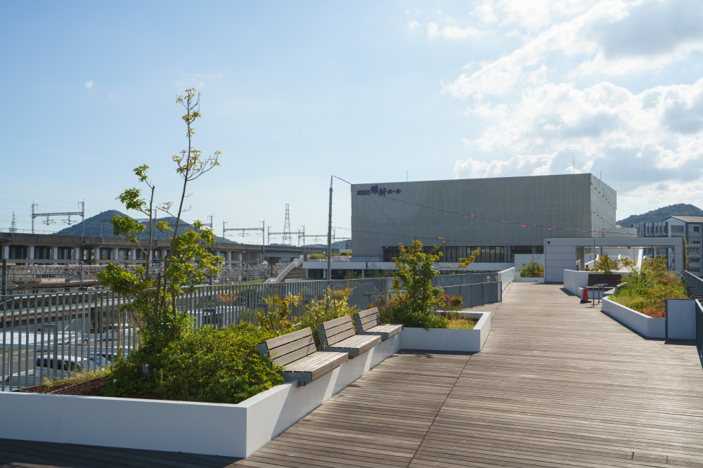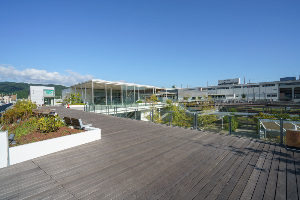 小休憩は、北口の2階にある「0テラス」で。長さ130mのデッキにはおしゃれなテーブルやイスが並んでおり、電車や山口の町並みが一望できる開放的な空間が広がっています。お店で購入した食べ物や飲み物を持ち込んで、リフレッシュしながら食事を楽しむのもおすすめです。