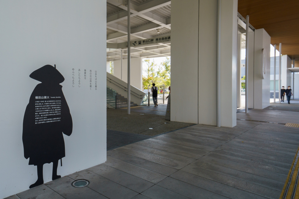 構内には山口の歴史や文化を感じられるスポットもたくさん!「0番線」という愛称で呼ばれる新山口駅北口駅前広場は、随所に地元の木材を利用し緑が調和したスタイリッシュな建築空間が魅力。真っ白な壁に描かれた山口県出身の俳人「種田山頭火」の姿や、何本も連なる柱に刻まれた山頭火の俳句と県内出身の詩人「中原中也」の詩は必見です。