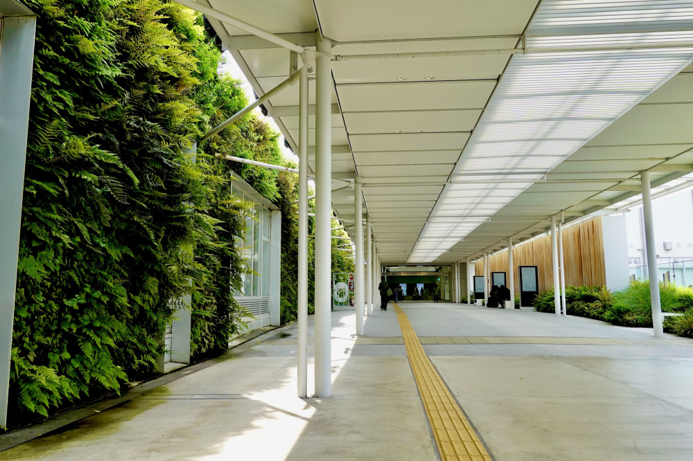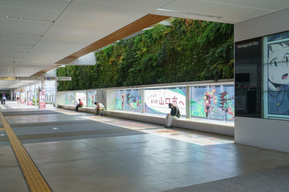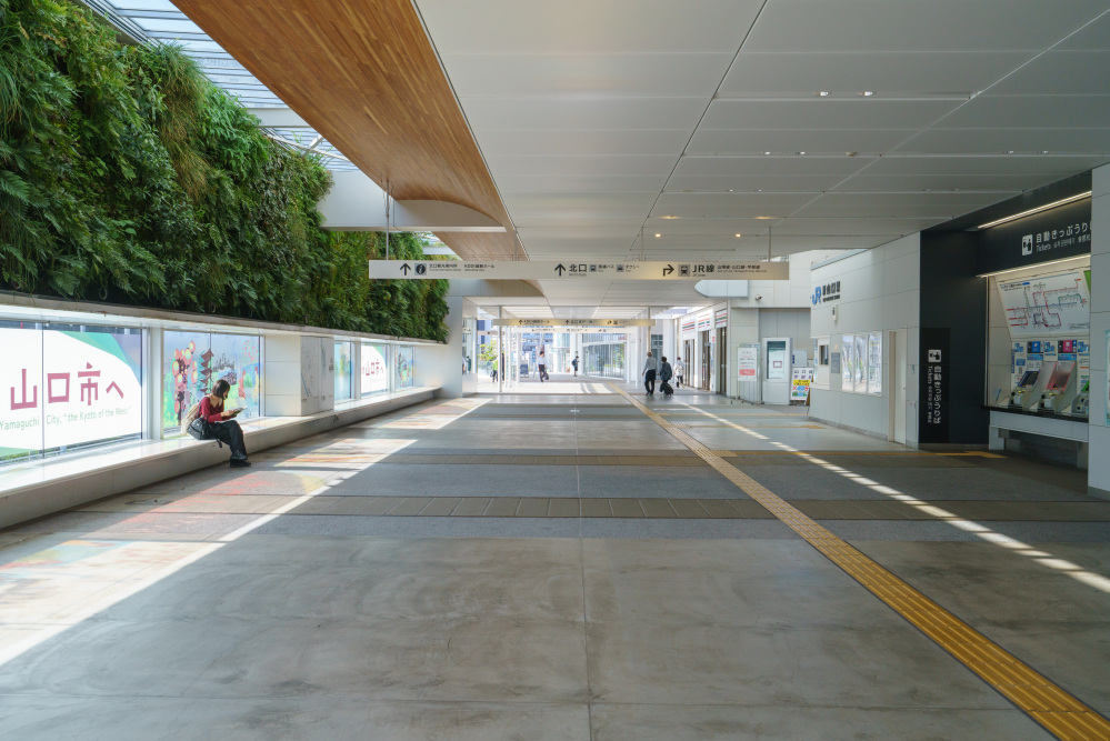 南口と北口を結ぶ通路を彩るのは、約100mに渡り植物が垂直に植えられた「垂直の庭」。世界的アーティスト、パトリック・ブランによる壁面緑化アートです。約140種類の植物のなかには山口県固有の植物も!植物の成長とともに、変化する姿を楽しめるのも魅力のひとつ。カメラの準備を忘れずに!