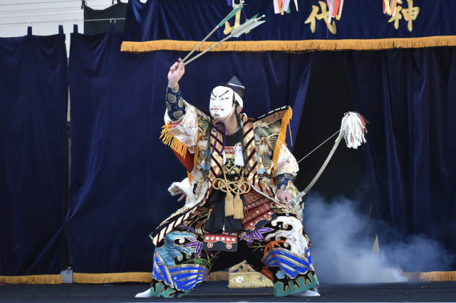 神楽の演目は「潮祓」(しほはらい)、「真榊」(まさかき)、「塵倫」(じんりん)、「八幡」(はちまん)、「猿」(さる)、「熊襲」(くまそ)、「天神」(てんじん)、「黒塚」(くろづか)、「鐘馗」(しょうき)、「岩戸」(いわと)、「大江山」(おおえやま)、「八岐の大蛇」(やまたのおろち)、「貴船」(きふね)、「女神」(じゅうら)の十四の舞がある。