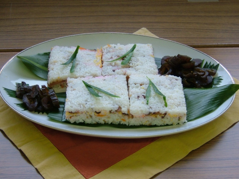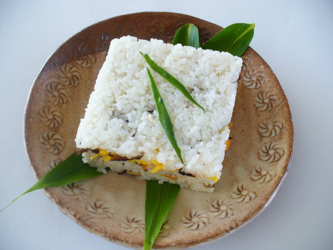 現代では、甘辛く煮たしいたけや、ほぐした白身の魚などの具材をすし飯で挟み込み、真っ白な表面にやなぎの葉に見立てたキュウリを乗せています。
