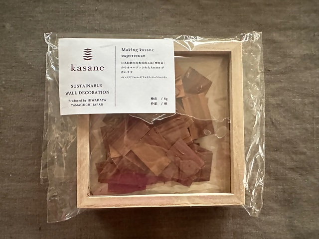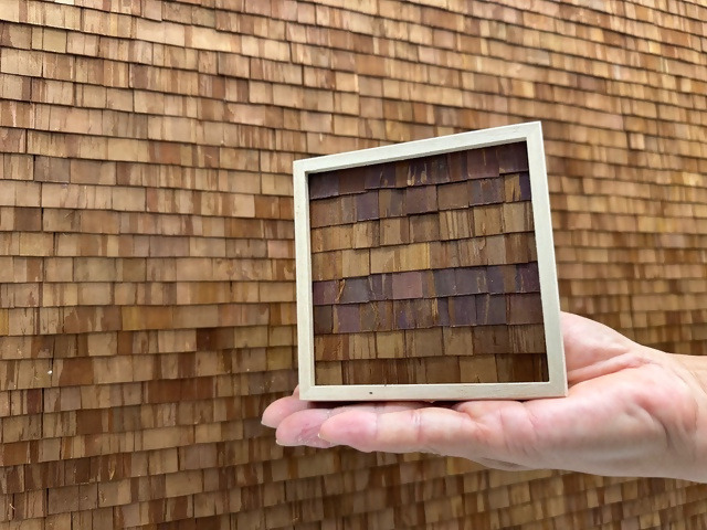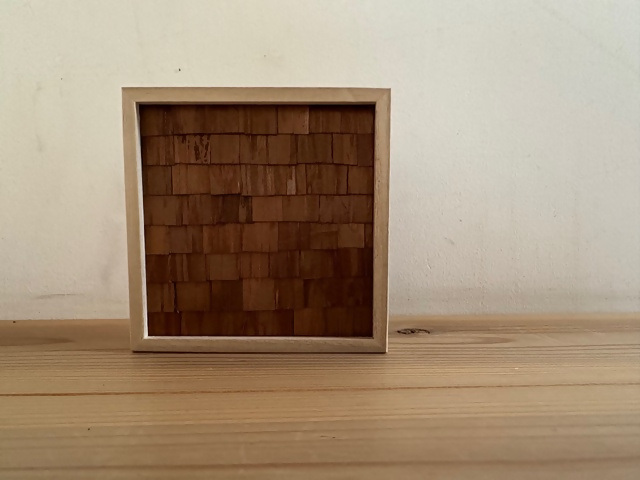 檜皮葺と同じピッチで7段ほど檜皮を貼り付けます。コースターにするため、皮の厚みを考慮し高さ調節します。皮の表裏の色の違いを生かしたパターンにするなど、個人の好みにより自由なアート体験ができます。さらに桐製フレーム入れて自立するインテリアフレームや小物入れとしてご利用いただけるアートフレーム体験はいかがでしょうか。英雲荘の見学もできます。
